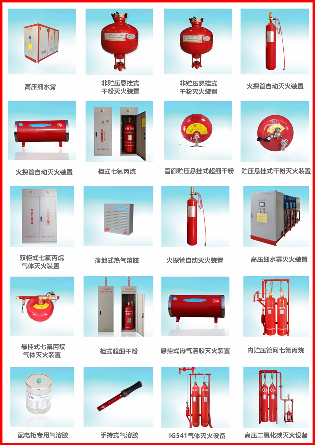 阀等组成,是一种智能型自动灭火系统。根据不同应用场所使用要求,可组成单元独立系统、组合分配系统,采用全淹没灭火方式,实现对单防护区和多防护区的灭火保护,技术先进、灭火效率高、维护方便。