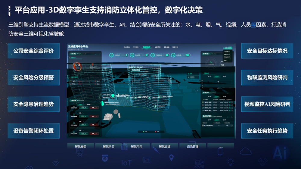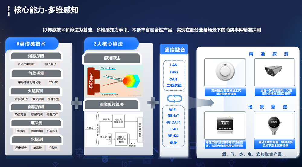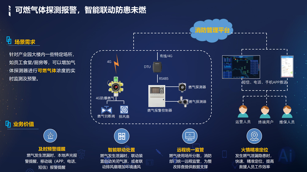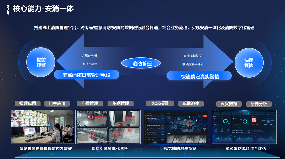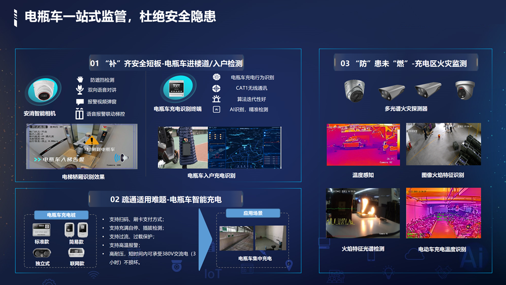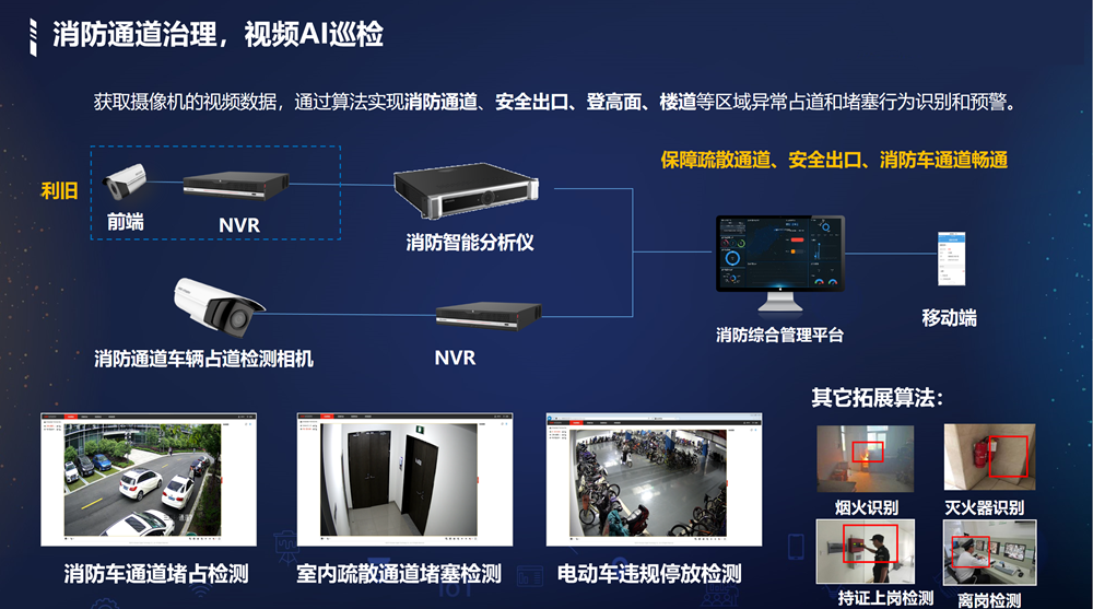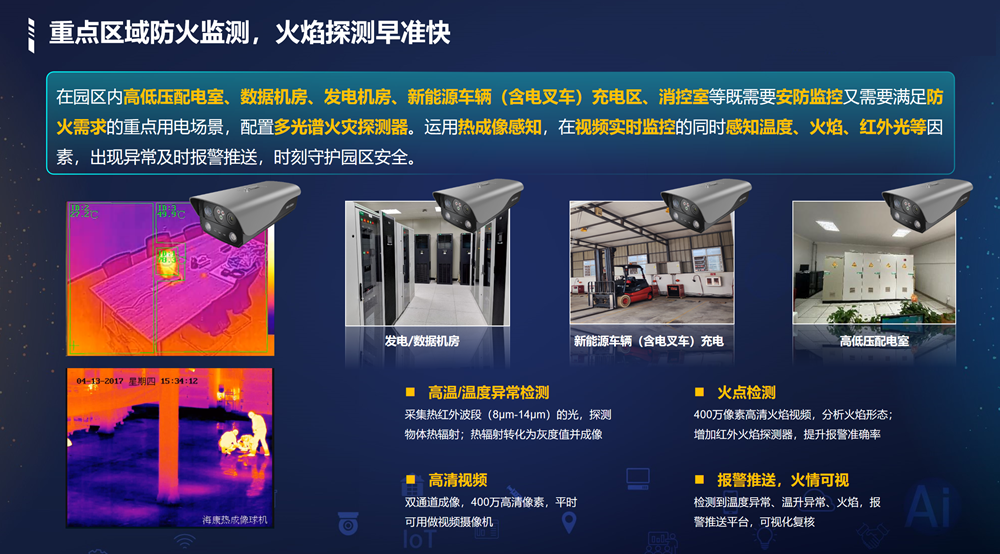感/燃气探测。运用热成像、相机AI识别等技术,实现消防重点区域温度预警、消防通道占