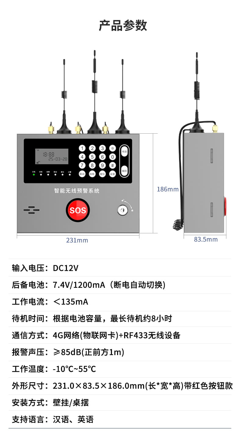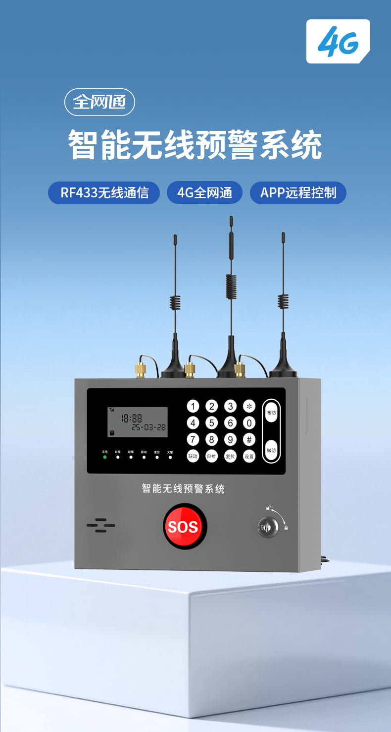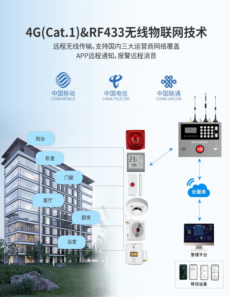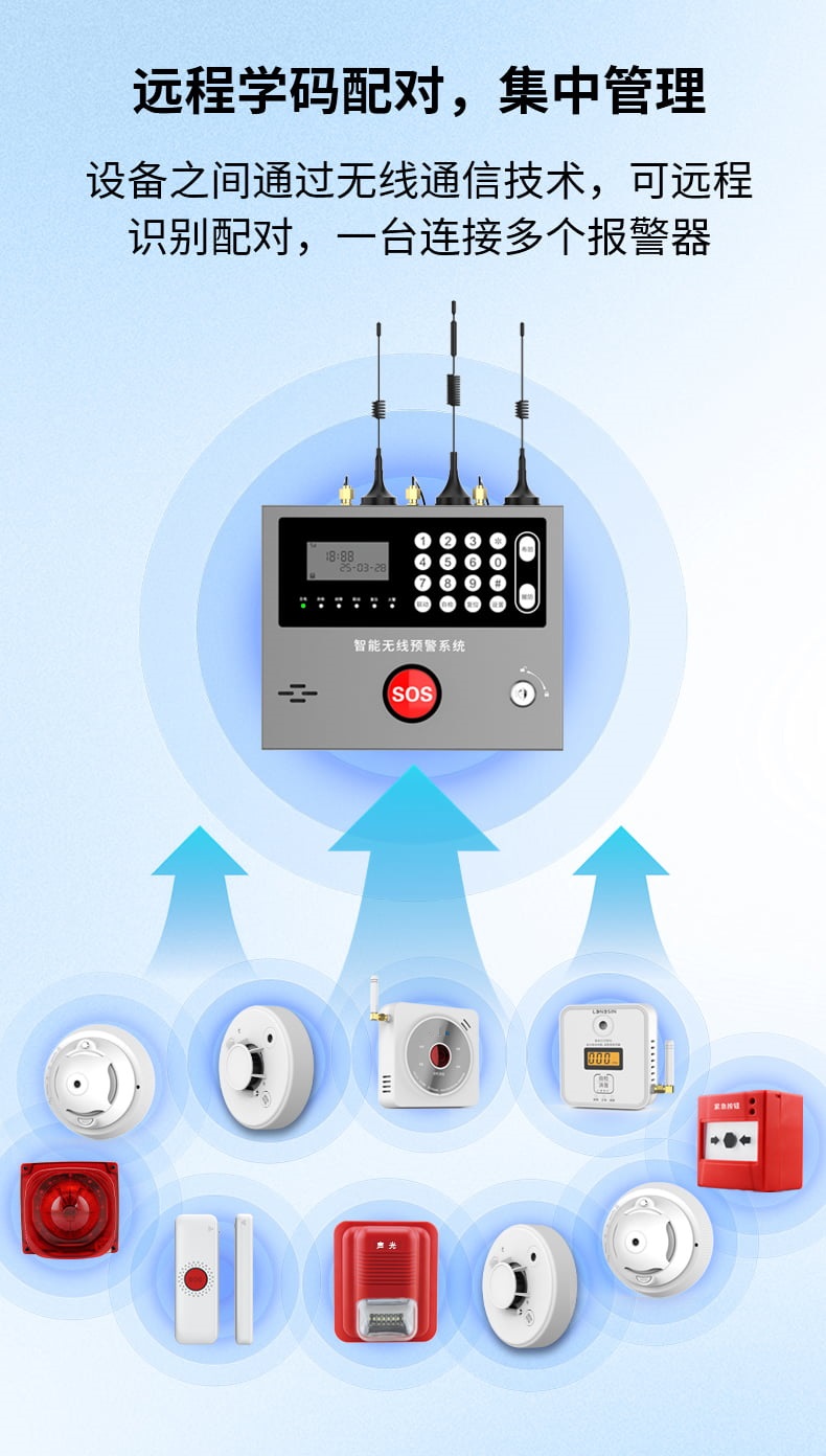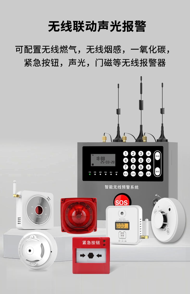 家用无线报警系统:监测门窗入侵、煤气泄漏、火灾等隐患,支持手机APP远程控制,适用于家庭、养老院等场景。