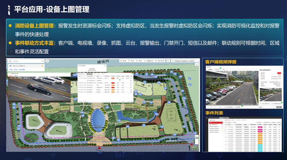 安消综合管理平台接入消防、视频、一卡通、停车场、报警监测等设备,通过安消联动,实现安防和消防全时可用、全局可视,提高园区信息化管理水平,实现降本增效。