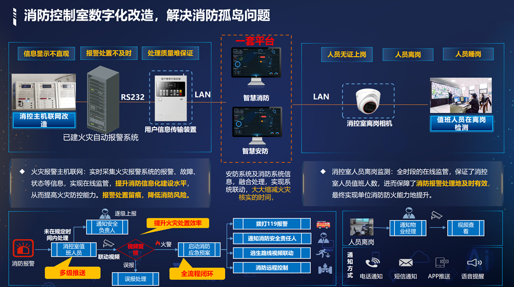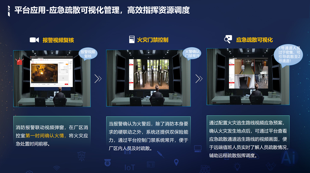 用报警、人员离岗检测。并可联动安防系统实现消防报警视频复核、门禁常开等应用。