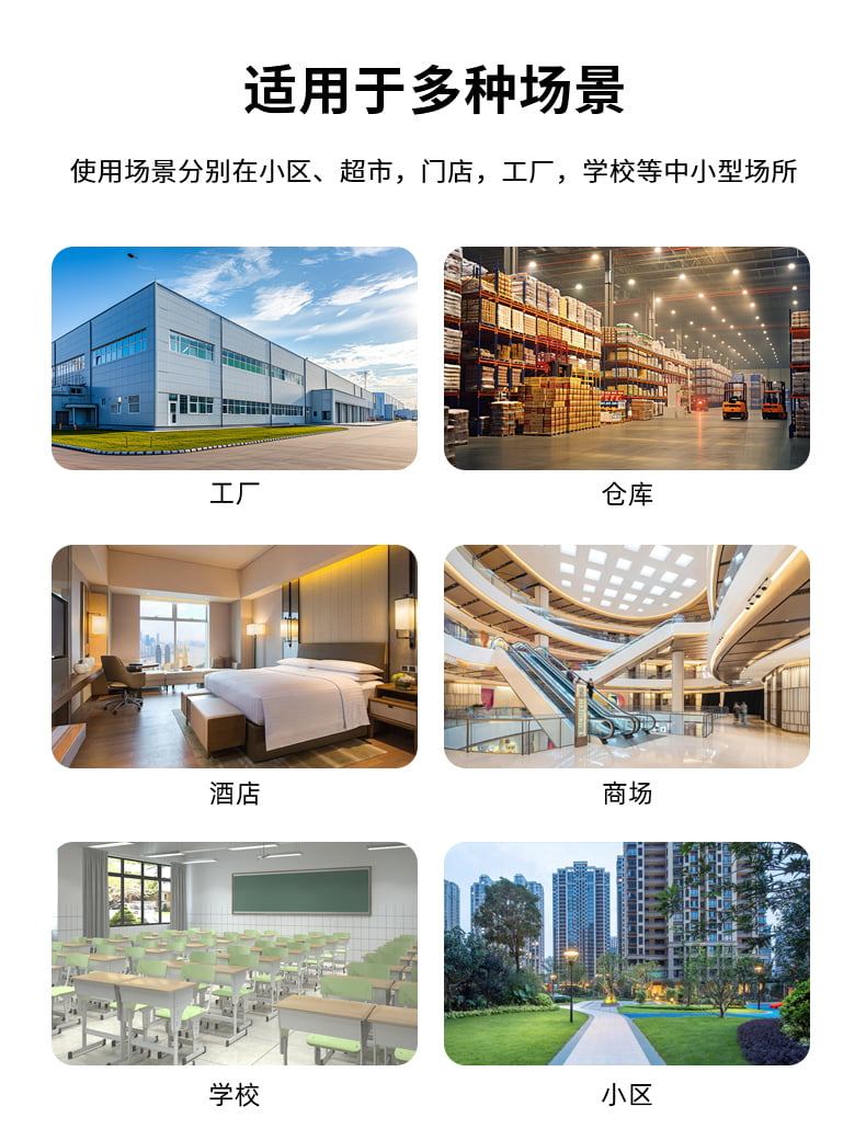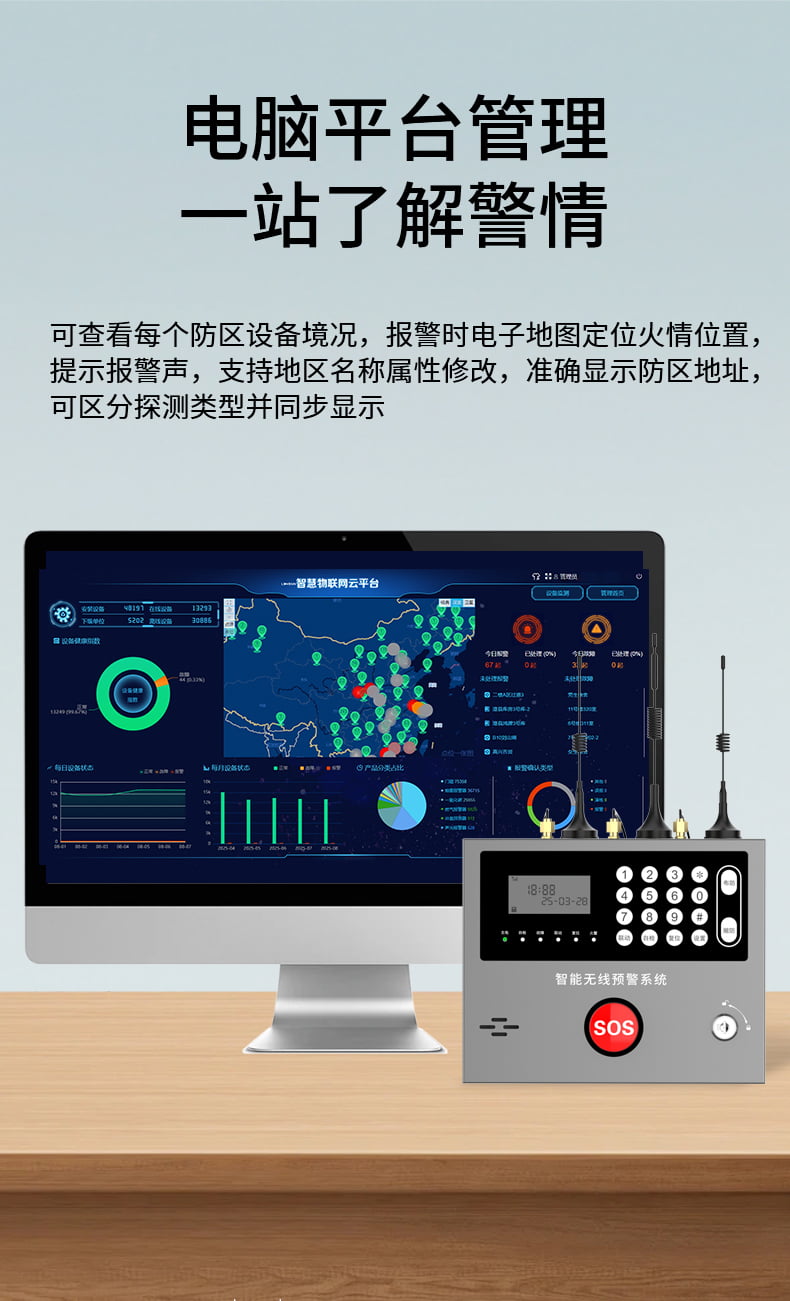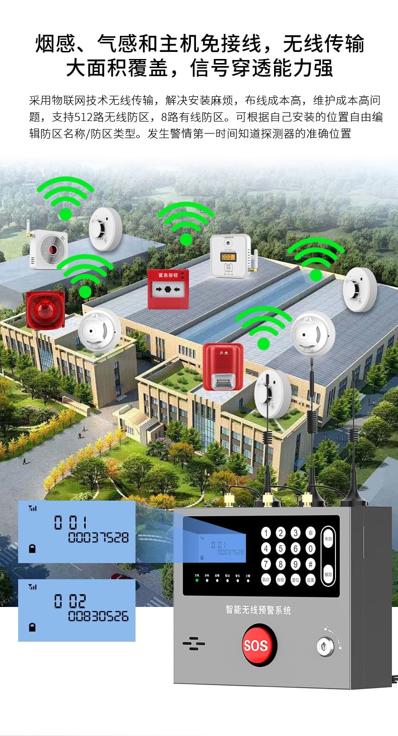智慧消防无线报警系统:实时监测烟雾、温度、可燃气体等隐患,适用于住宅、商场、工厂、学校等场所。
